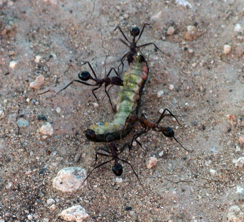 As I sipped my coffee and praised God for the lovely weather, something caught my eye. I looked down and noticed a few black ants moving about on the patio, circling and darting about a recently deceased green worm. Yuck, right? Well, it was what these ants did next that captured my attention and got me to thinking about how awesome and amazing our God is. These ants (God’s creation) worked together brilliantly and began to drag and carry the worm off, presumably to the ant den (see image below).