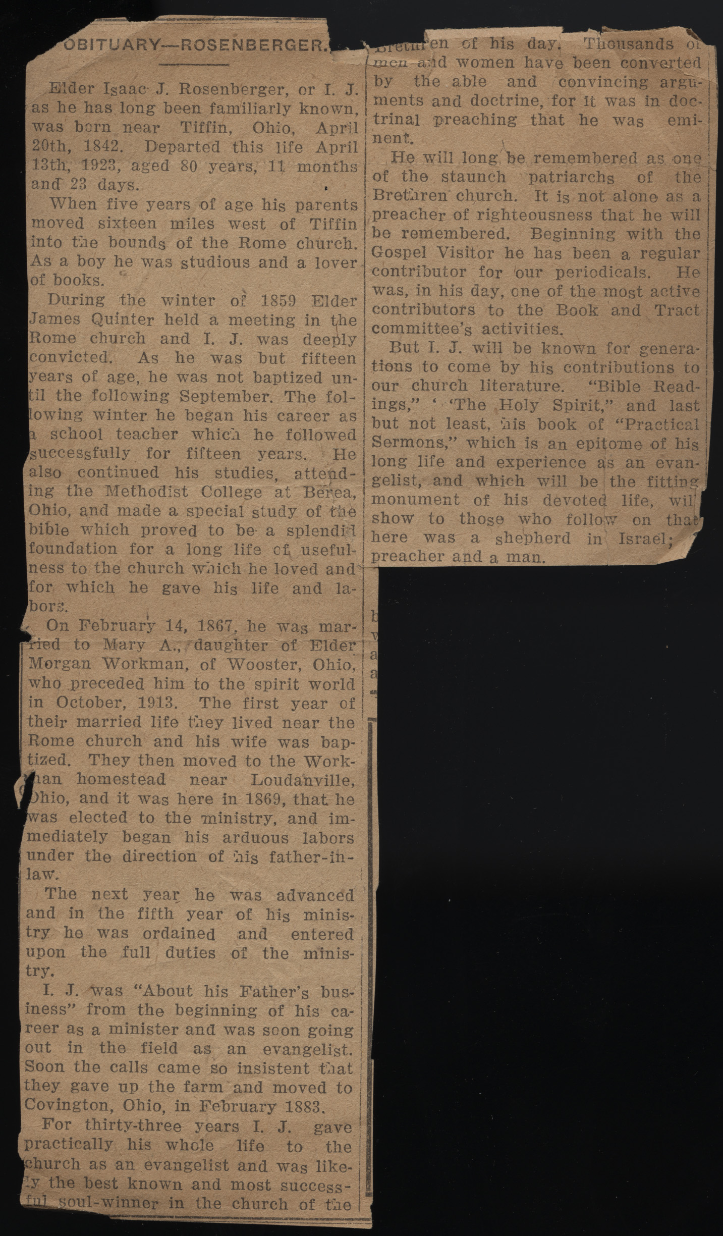 His name was Isaac J. Rosenberger—a Pioneer and Patriarch of the Church of the Brethren. Those intimately familiar with him called him, IJ. He was born near Tiffin, Ohio on April 20, 1842 and went to be with the Lord on April 13, 1923, at the age of 80.