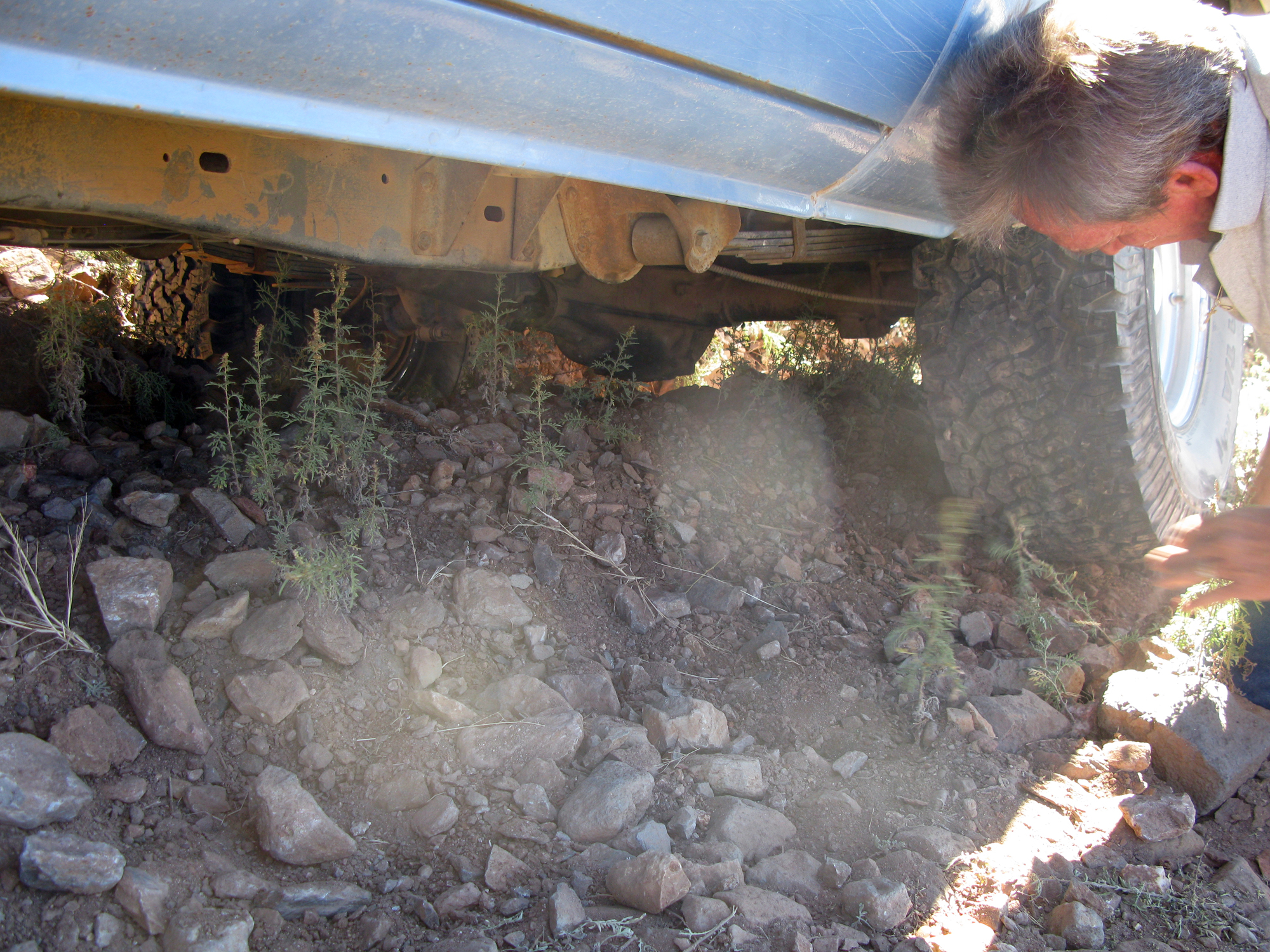 As we crawled along, the road was becoming worse, much worse. On my side of the Jimmy, the ruts were as deep as three feet and in my estimation, not a good thing to fall into. On the driver’s side of the Jimmy was a cliff–one wrong turn of the wheel and we would barrel straight down into the belly of the wash we just left.