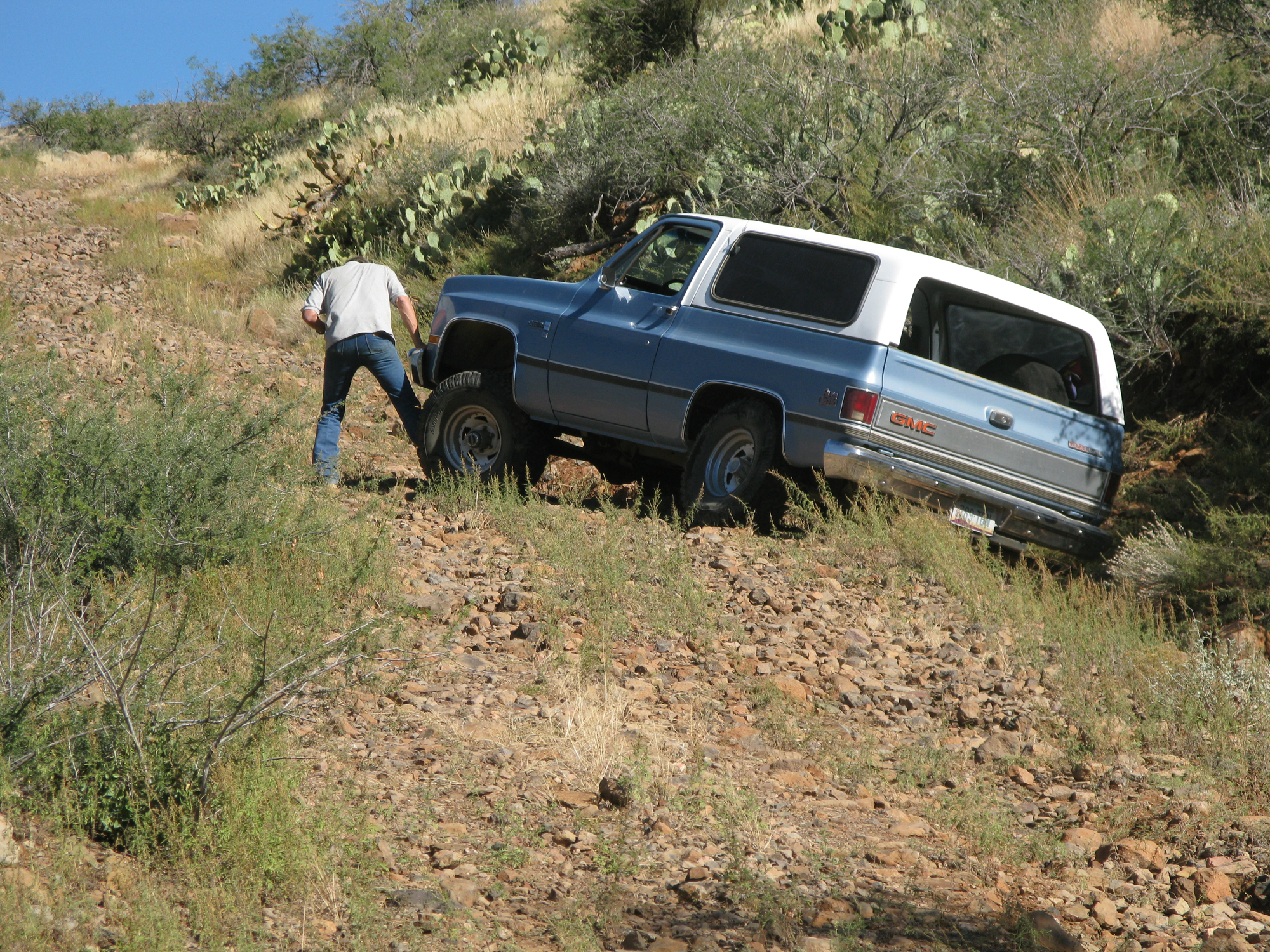 Back down? What? And before I could object, into reverse we went…my husband fighting the steering wheel to avoid the deep gullies on my side of the Jimmy, the bone dry earth giving way under our spinning tires and forcing the Jimmy into the deep ruts we wanted to avoid. At the same time, my husband was trying to prevent the Jimmy from sliding over too far on his side which would have thrown us straight off the edge and down the cliff we would tumble.